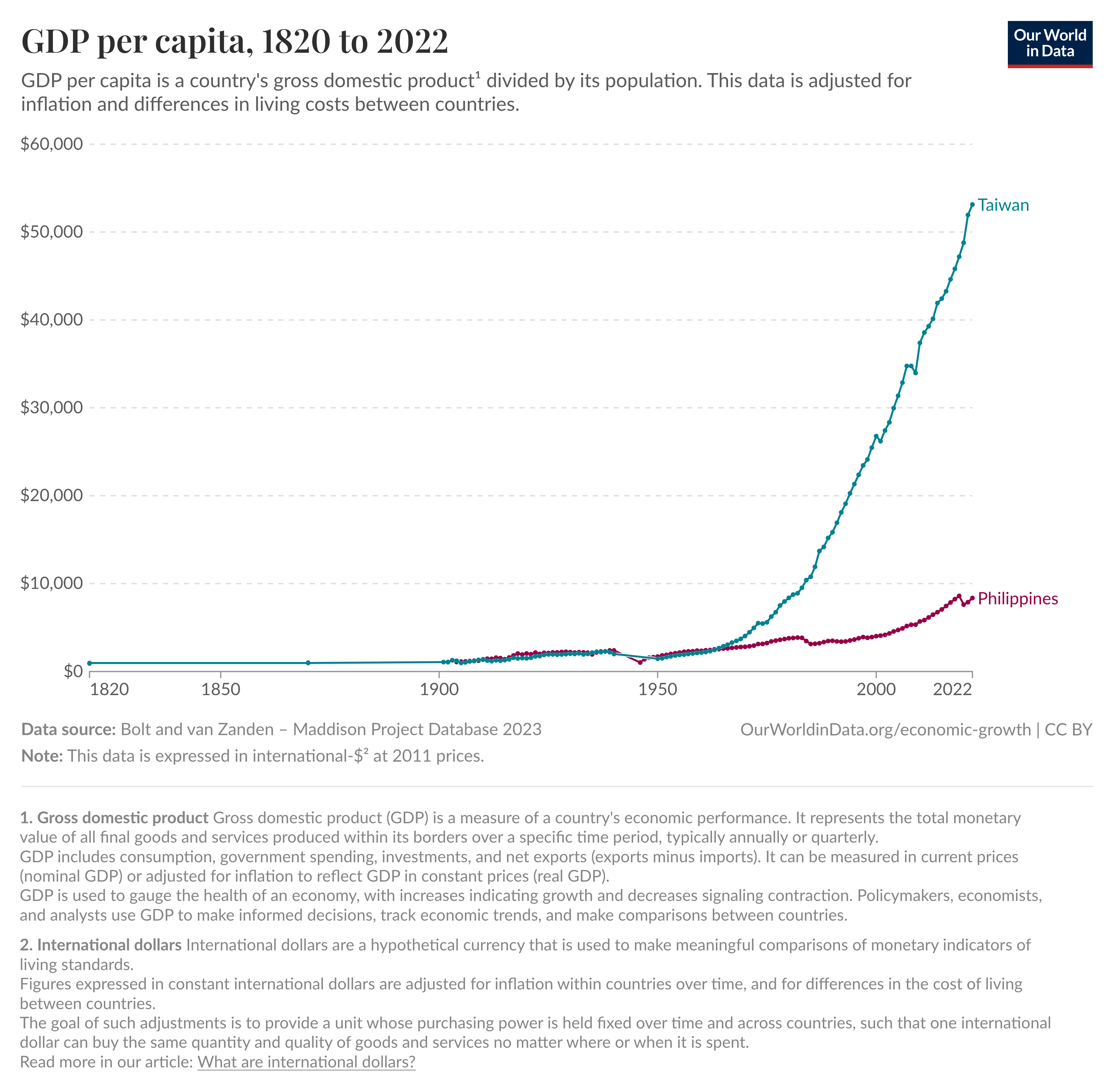 Around the middle of the 20th century, Taiwan was about as rich as the Philippines. Today, the gap between the two seems insurmountable. How is this possible? Economists have many theories that try to explain this. And there are different growth models that different countries used to achieve it, South Korea probably being the most famous example. It is also not difficult to name some factor on which growth depends (i.e. you need stable institutions, guaranteed property rights, then you need to ascend the value chain in production, etc.). The difficulty is to find the most relevant ones.
