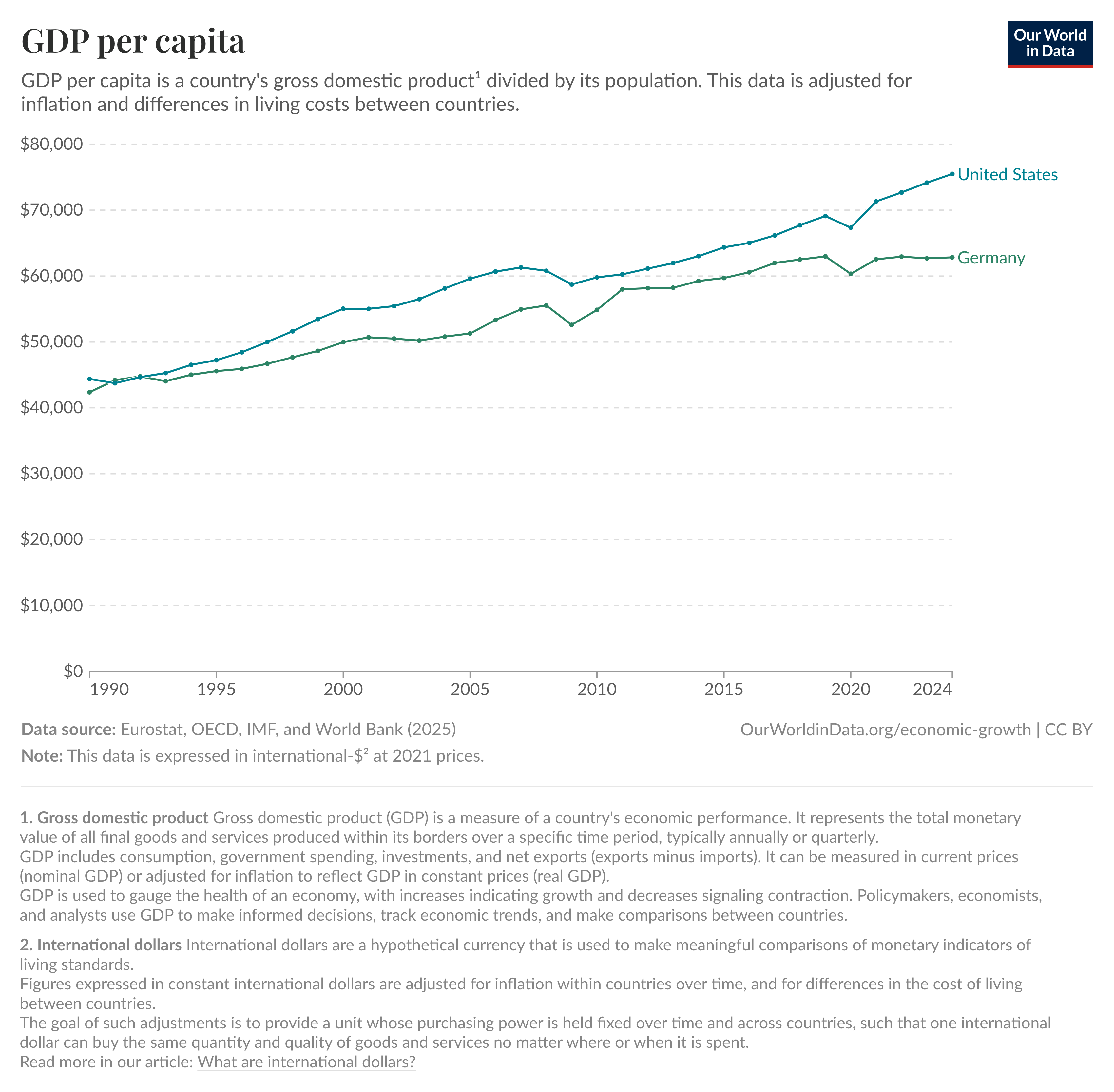 Around 1990, Germany was about as rich as the US. One reading: Today Germany could be as rich as the US. They were somewhat close again around the financial crisis of 2008. But since then, the US has taken off. Especially painful to see is Germany's performance in the last five years: It's economy has either stagnated or declined. Meanwhile the US kept growing.